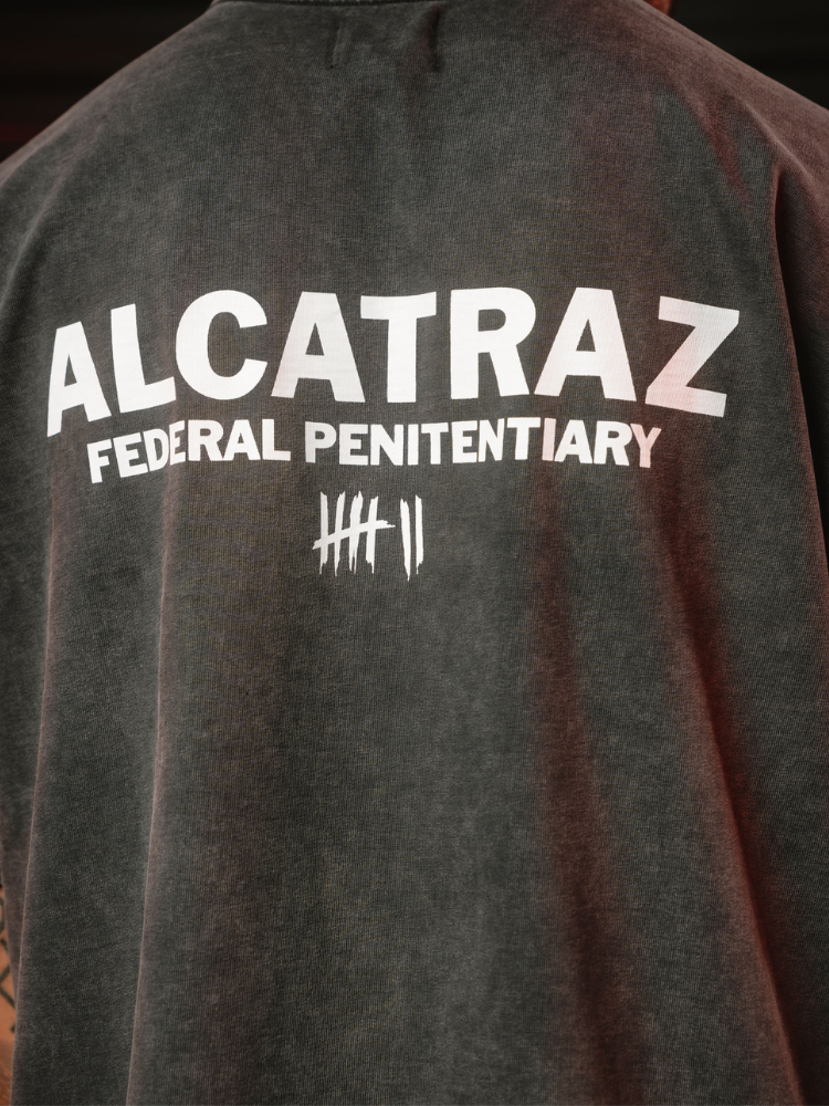 Introducing the Alcatraz T-Shirt in washed black. Built from a premium 300gsm heavyweight cotton. This T-shirt features a unique vintage washed finish for a soft and worn in feel. Designed with a slightly oversized and boxy fit. Each item is individually hand finished with the standout Alcatraz design on the back and Seven Sins inmate graphic on the chest. A personal go-to for many, this T-shirt has also earned its place as a fan favourite.