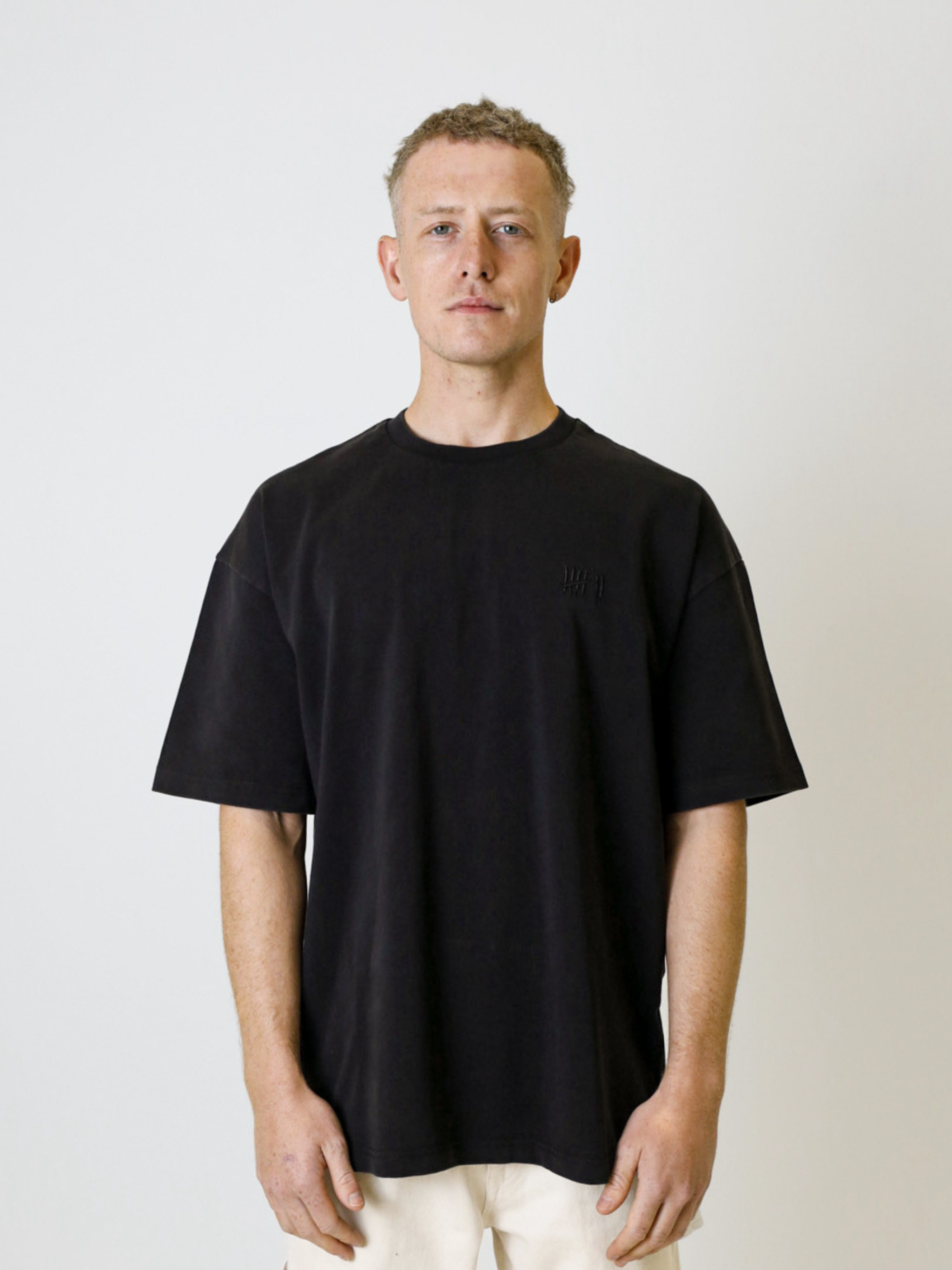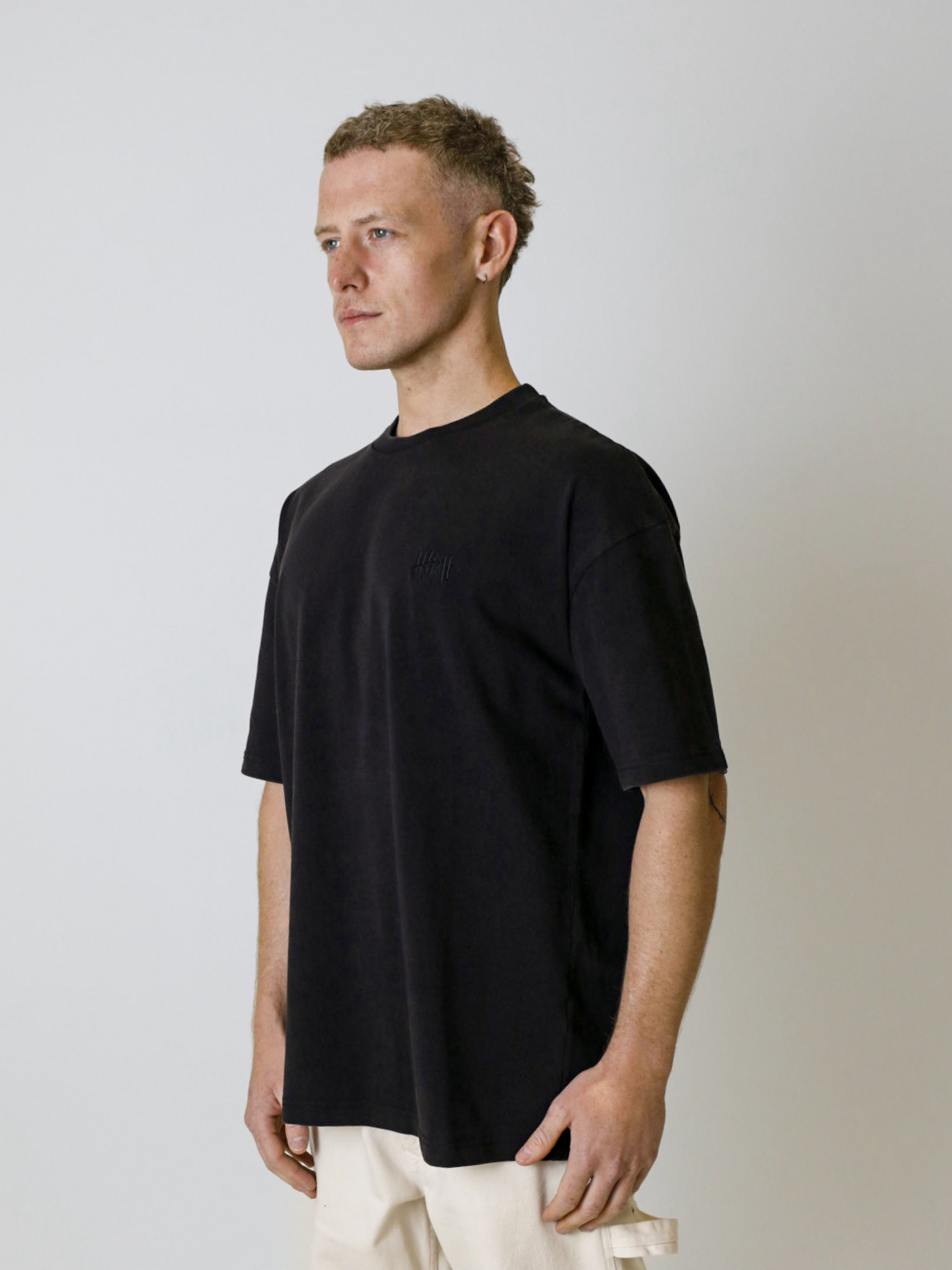 Finished in a deep black tone, the fabric offers a clean, versatile base with a refined edge. Tonal embroidery of our signature Tally mark sits subtly on the chest – a considered detail that reflects the understated identity of the Core Collection. Designed for daily rotation and long-term wear, this piece blends premium construction with everyday versatility.
