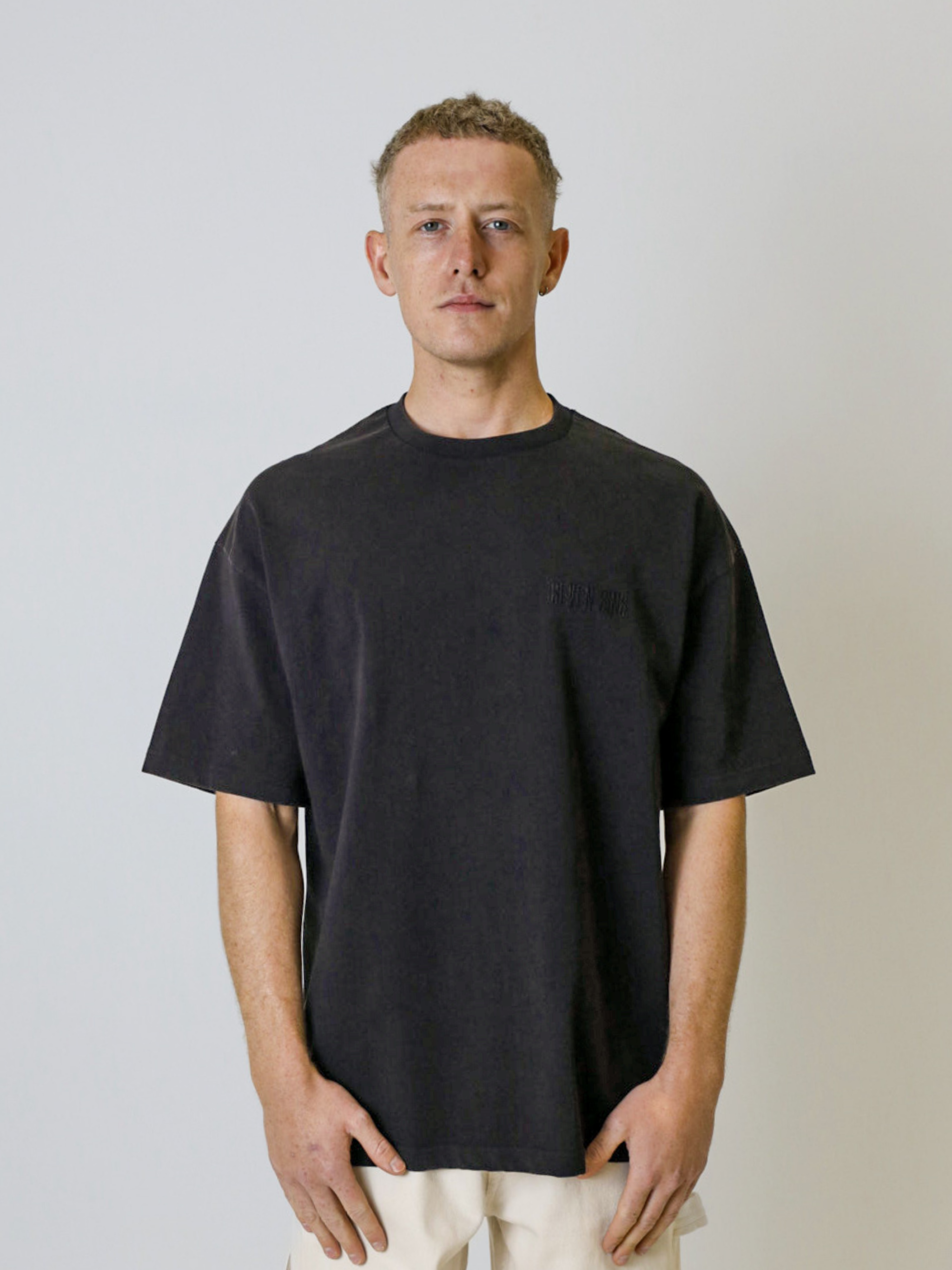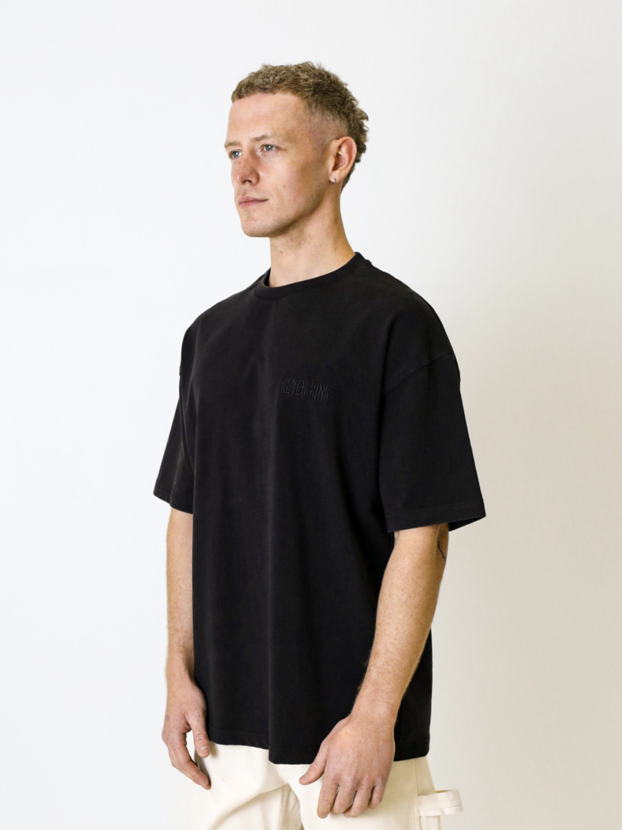 Finished in a deep black tone, the fabric offers a clean, versatile base with a refined edge. Tonal embroidery of our signature Tally mark sits subtly on the chest — a considered detail that reflects the understated identity of the Core Collection. Designed for daily rotation and long-term wear, this piece blends premium construction with everyday versatility.