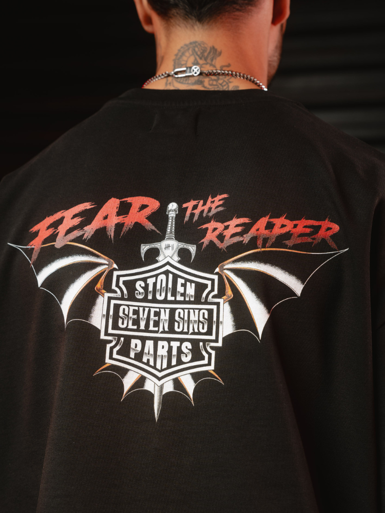 Introducing the Fear the Reaper T-Shirt in black. Crafted from 100% premium cotton, this T-shirt is constructed from a 300gsm heavyweight fabric. Designed with a slightly oversized, boxy fit. Each item is individually hand-finished with the bold Fear the Reaper graphic on the back and Seven Sins shield on the chest.