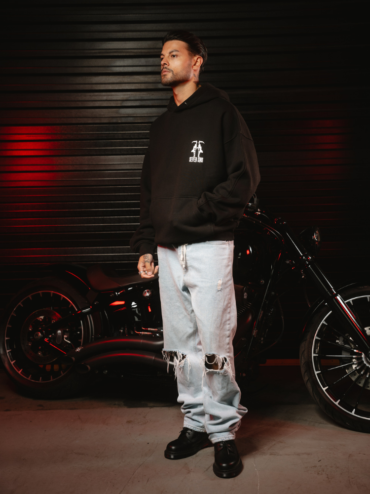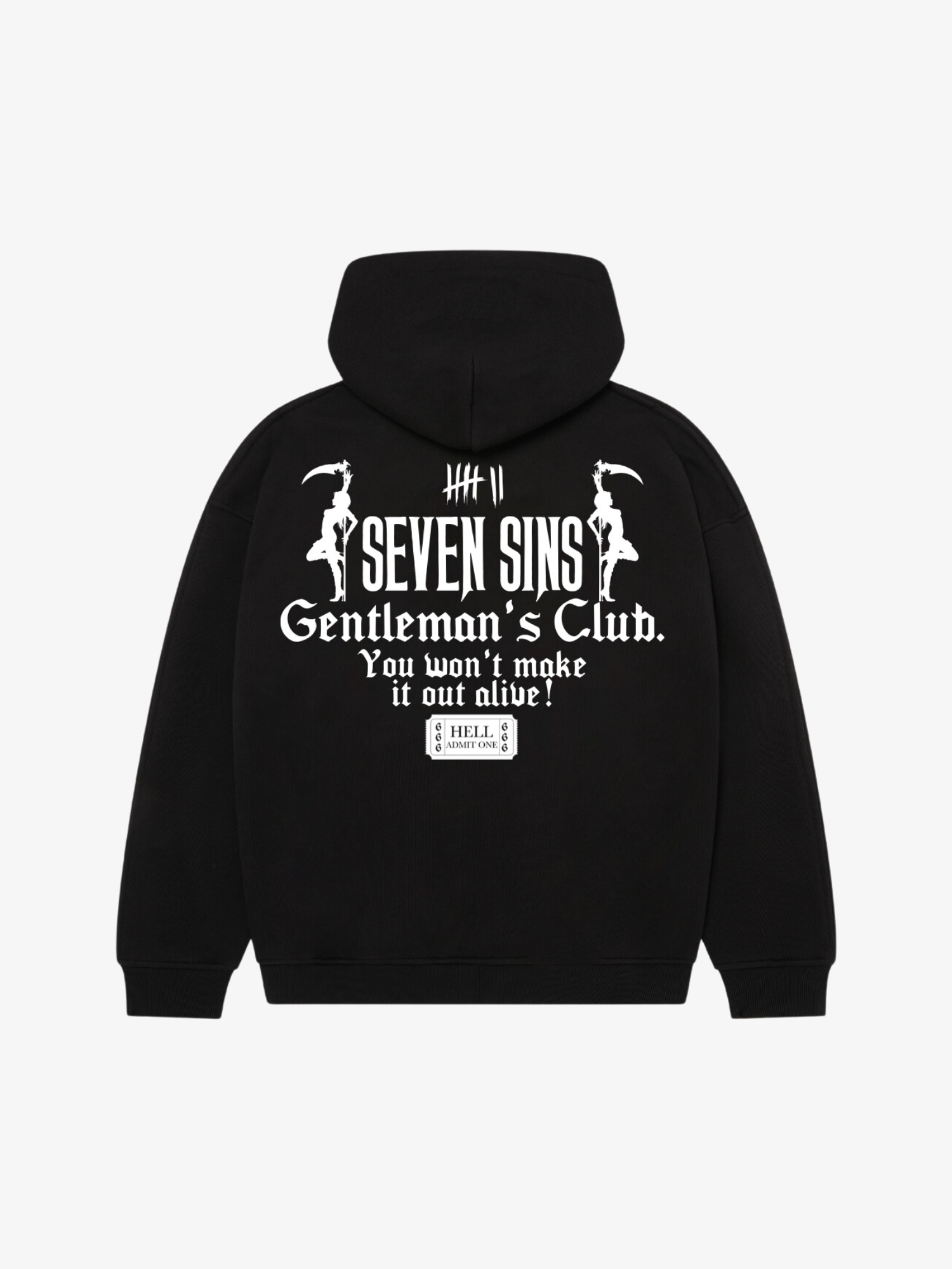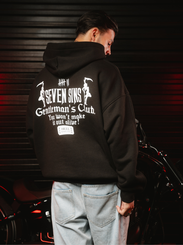 Introducing the Seven Sins Gentleman’s Club Hoodie. Crafted from 100% cotton with a heavyweight 500gsm custom-knit French terry fabric. It features a slightly oversized, drop shoulder fit for a relaxed feel. Each Hoodie is hand-finished individually with the Gentleman’s Club design on the back and Seven Sins graphic on the chest.