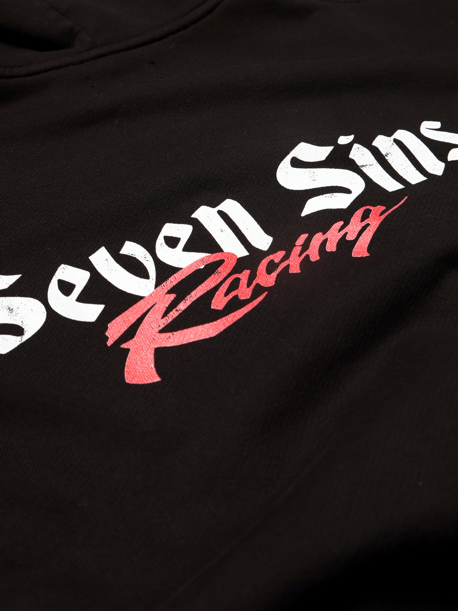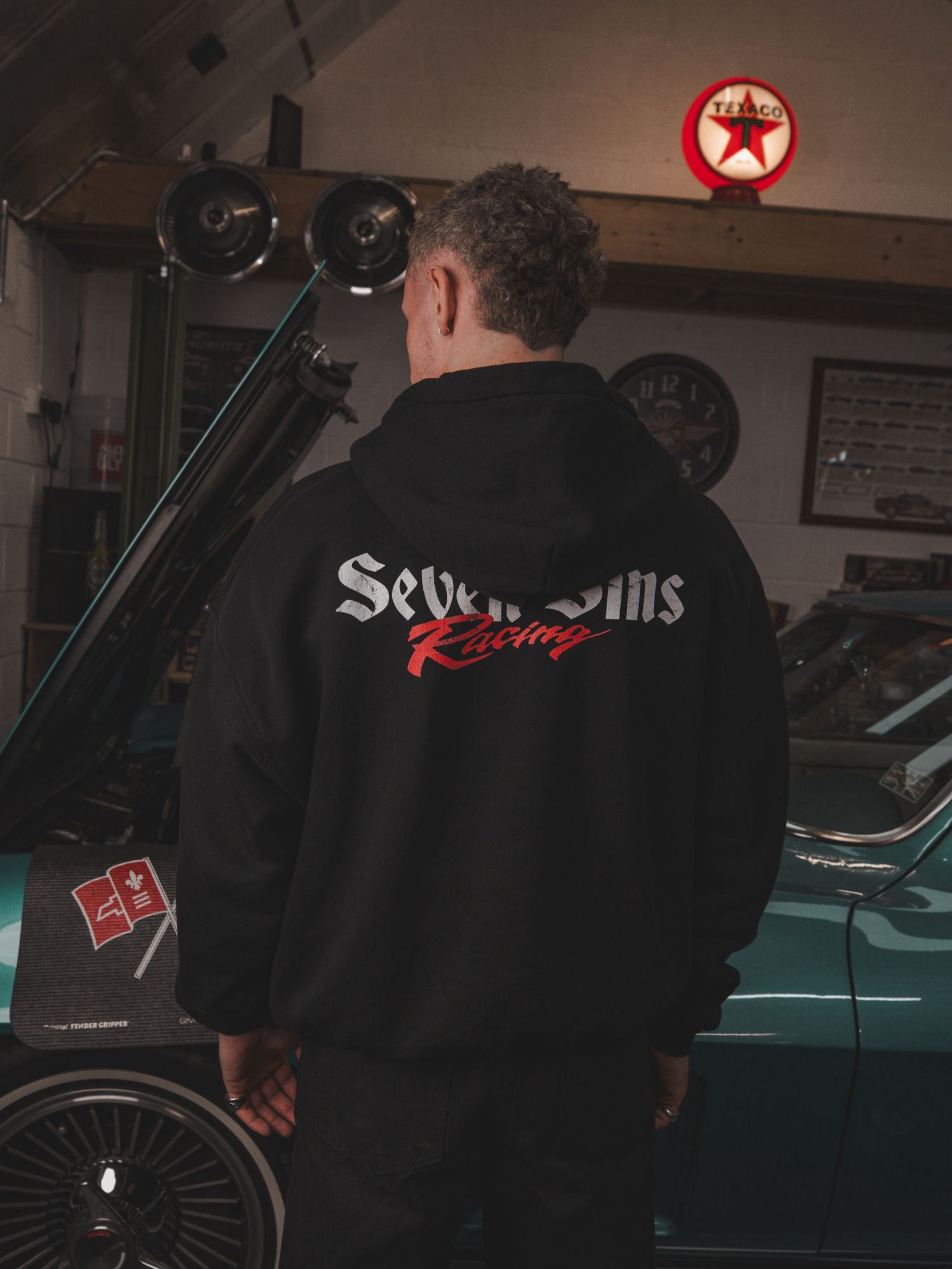 Introducing the Racing Hoodie in Black. This Hoodie is crafted from premium 490gsm heavyweight cotton, offering a substantial, premium feel. Its cropped, boxy silhouette with slightly dropped shoulders provides a relaxed fit. Each piece is individually hand-finished. Featuring Seven Sins Racing graphic to the chest. Finished with slight distressing to the hood and the cuffs.