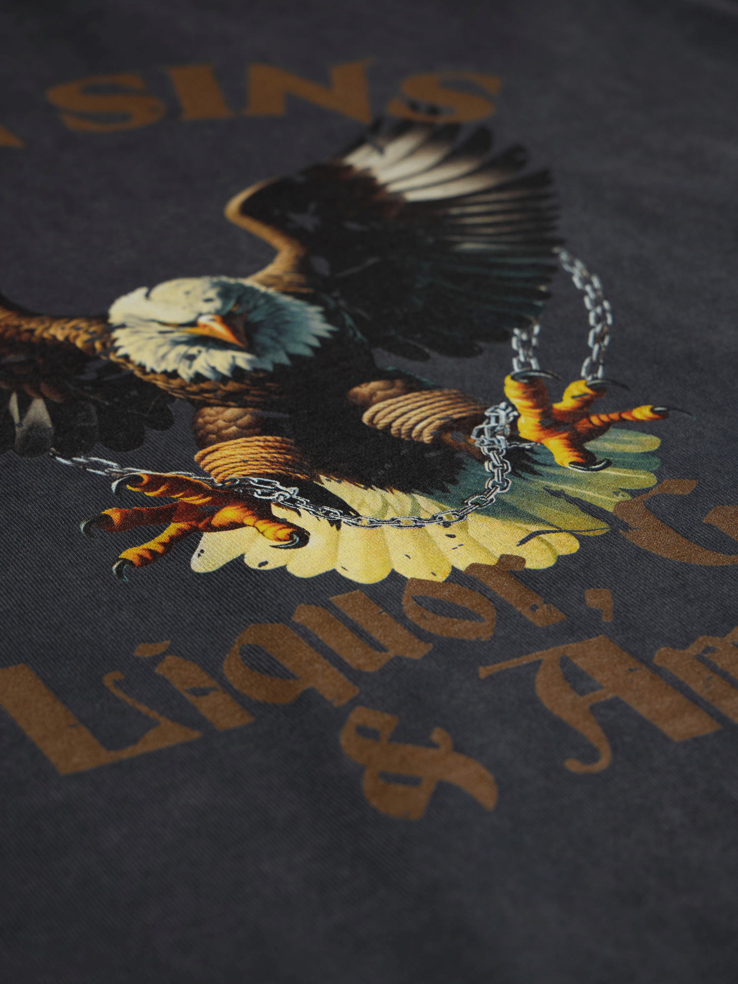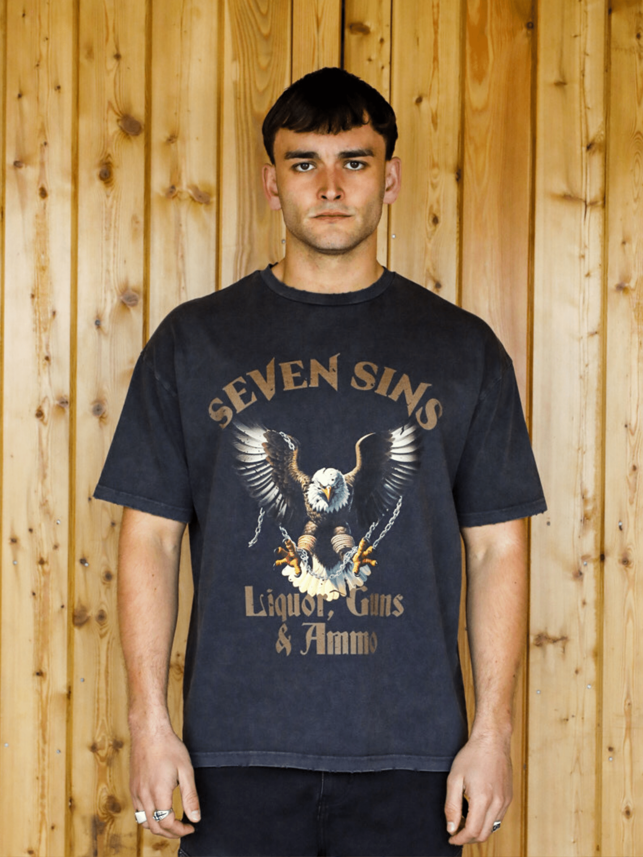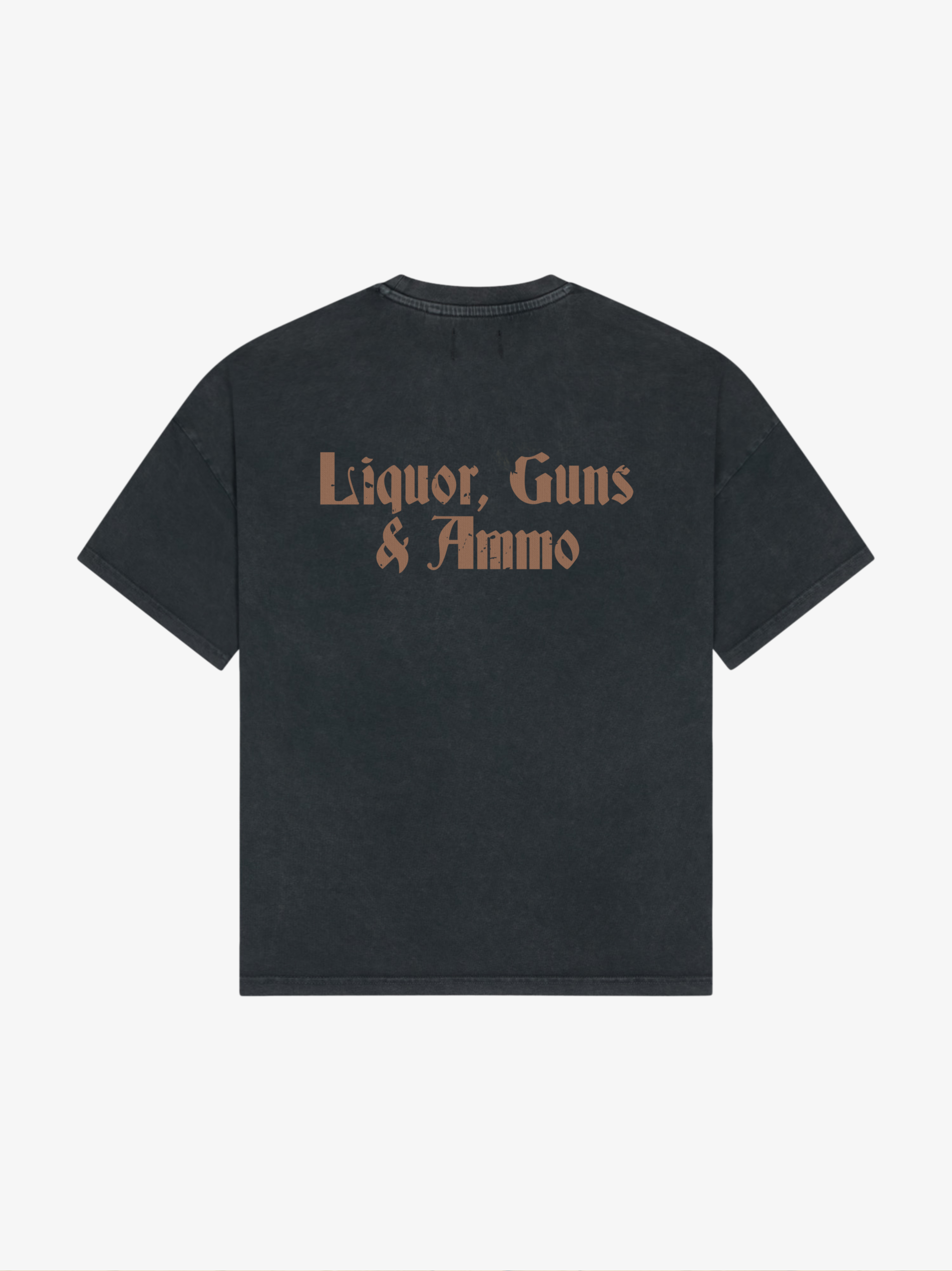 Introducing the Liquor, Guns & Ammo T-Shirt in Vintage Black. This T-Shirt is crafted from premium 300gsm heavyweight cotton, offering a substantial, premium feel. Its boxy silhouette provides a relaxed fit. Each piece is individually hand-finished, featuring our bold Liquor, Guns & Ammo graphic printed on the front and text on the back.
