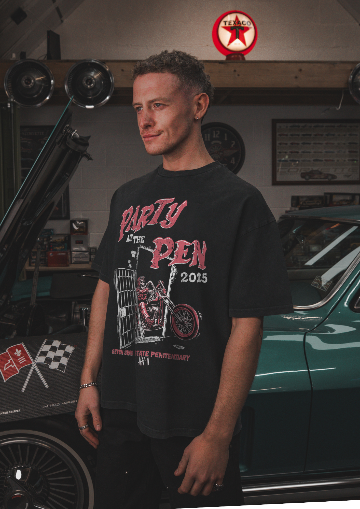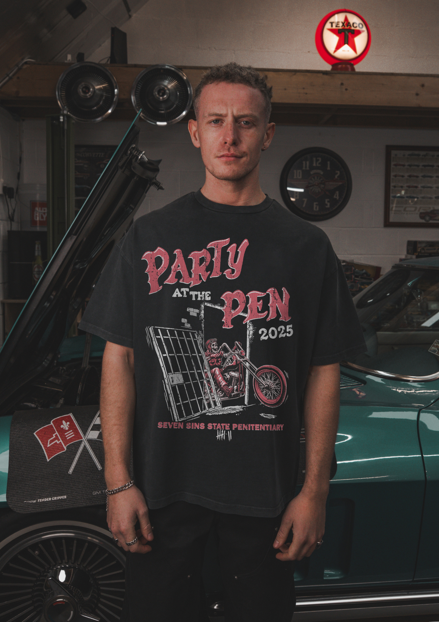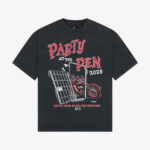 Introducing the Party at the Pen Tee in vintage black. This T-Shirt is crafted from premium 300gsm heavyweight cotton, offering a substantial, premium feel. Its boxy silhouette provides a relaxed fit. Each piece is individually hand-finished, featuring Party at the Pen graphics to both sides of the chest and back.