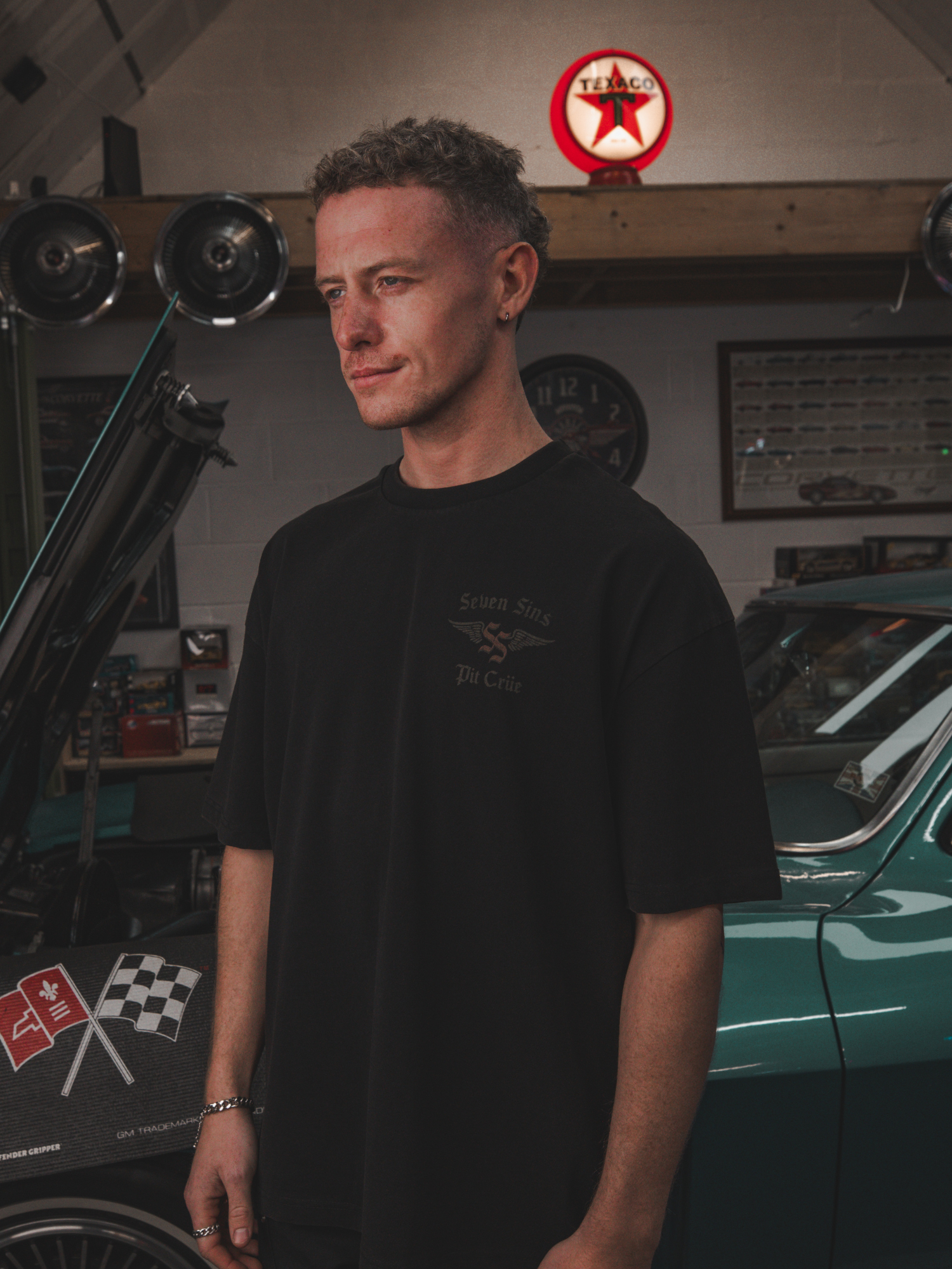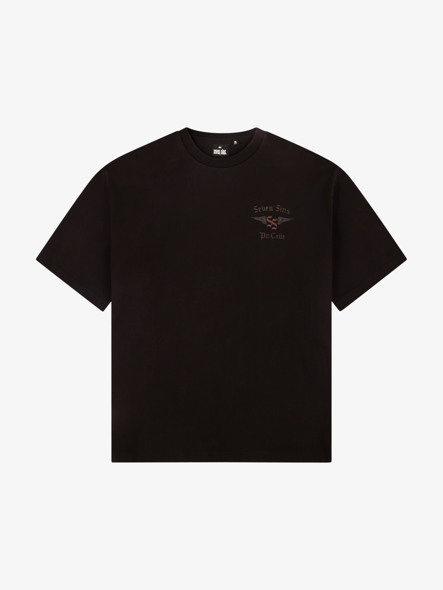 Introducing the Pit Crüe T-shirt in black. This T-Shirt is crafted from premium 300gsm heavyweight cotton, offering a substantial, premium feel. Its boxy silhouette provides a relaxed fit. Each piece is individually hand-finished, featuring the Pit Crüe graphic to the chest and back.