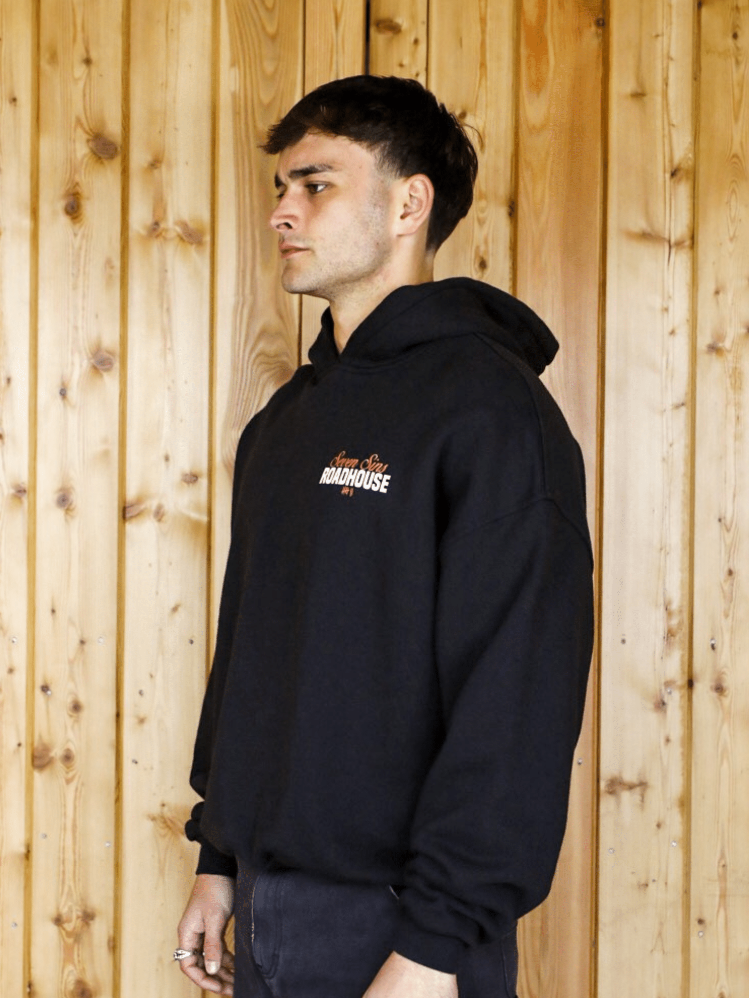 Introducing the Roadhouse Hoodie in Black. This Hoodie is crafted from premium 490gsm heavyweight cotton, offering a substantial, premium feel. Its cropped, boxy silhouette with slightly dropped shoulders provides a relaxed fit. Each piece is individually hand-finished, featuring our Seven Sins Roadhouse graphic printed on both the chest and back. Finished with slight distressing to the hood and cuffs.