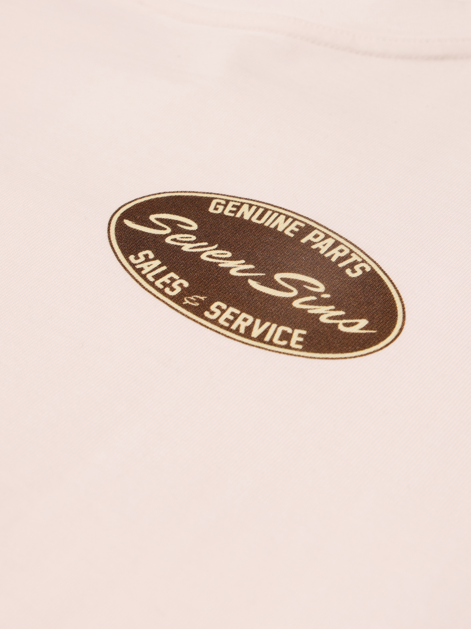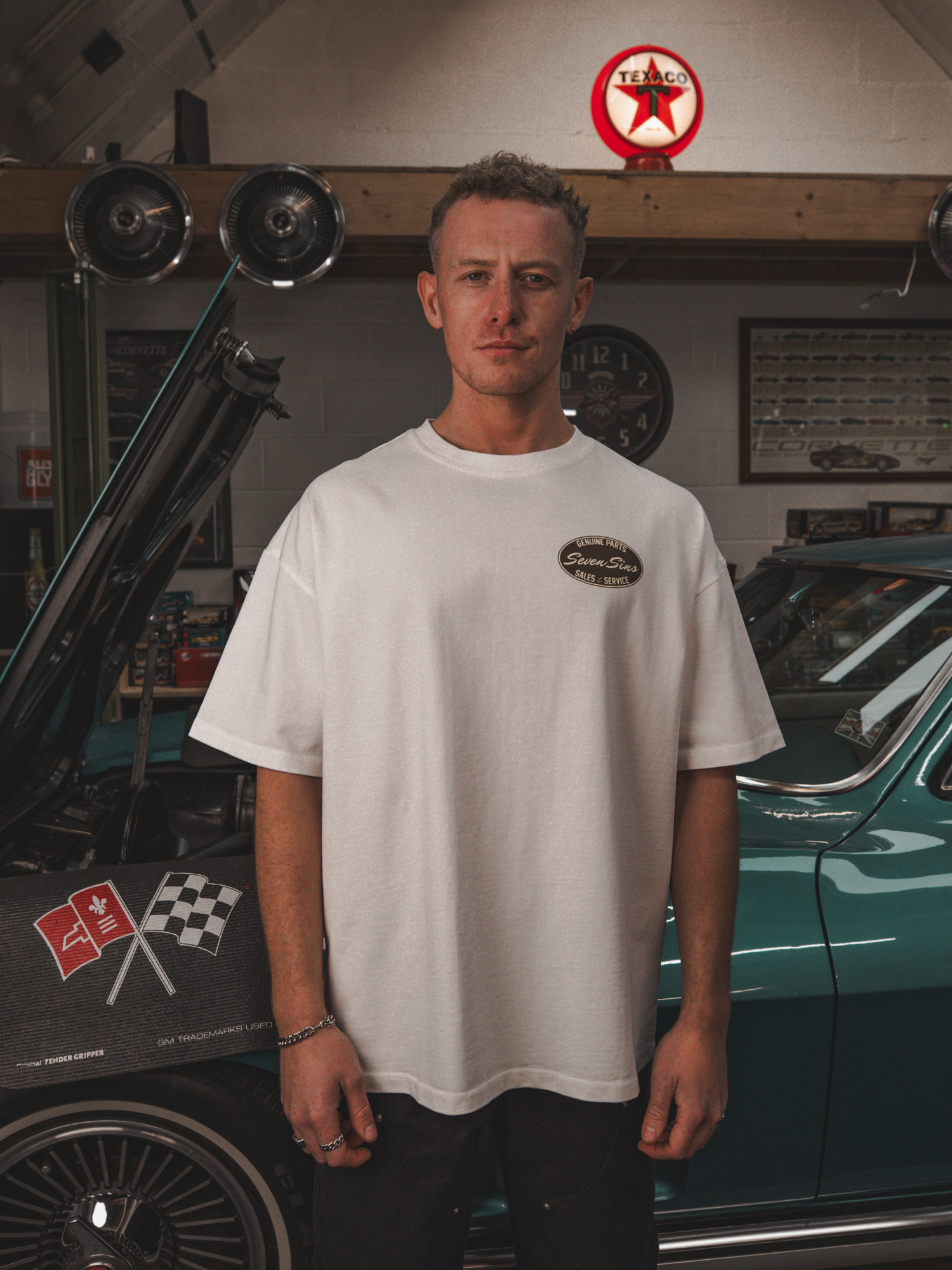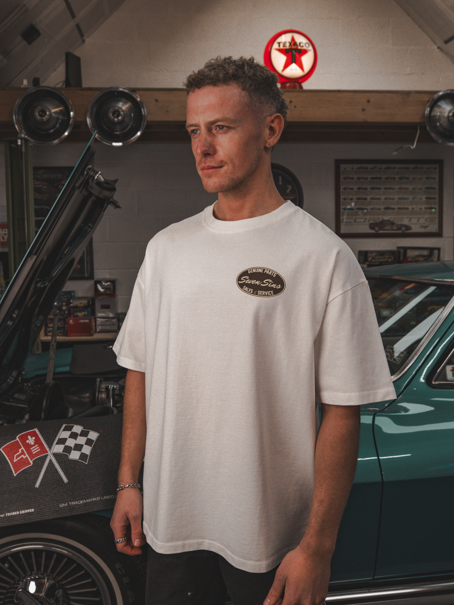 Introducing the Sales & Service T-shirt in white. This T-Shirt is crafted from premium 300gsm heavyweight cotton, offering a substantial, premium feel. Its boxy silhouette provides a relaxed fit. Each piece is individually hand-finished, featuring the Sales & Service graphic to the chest.