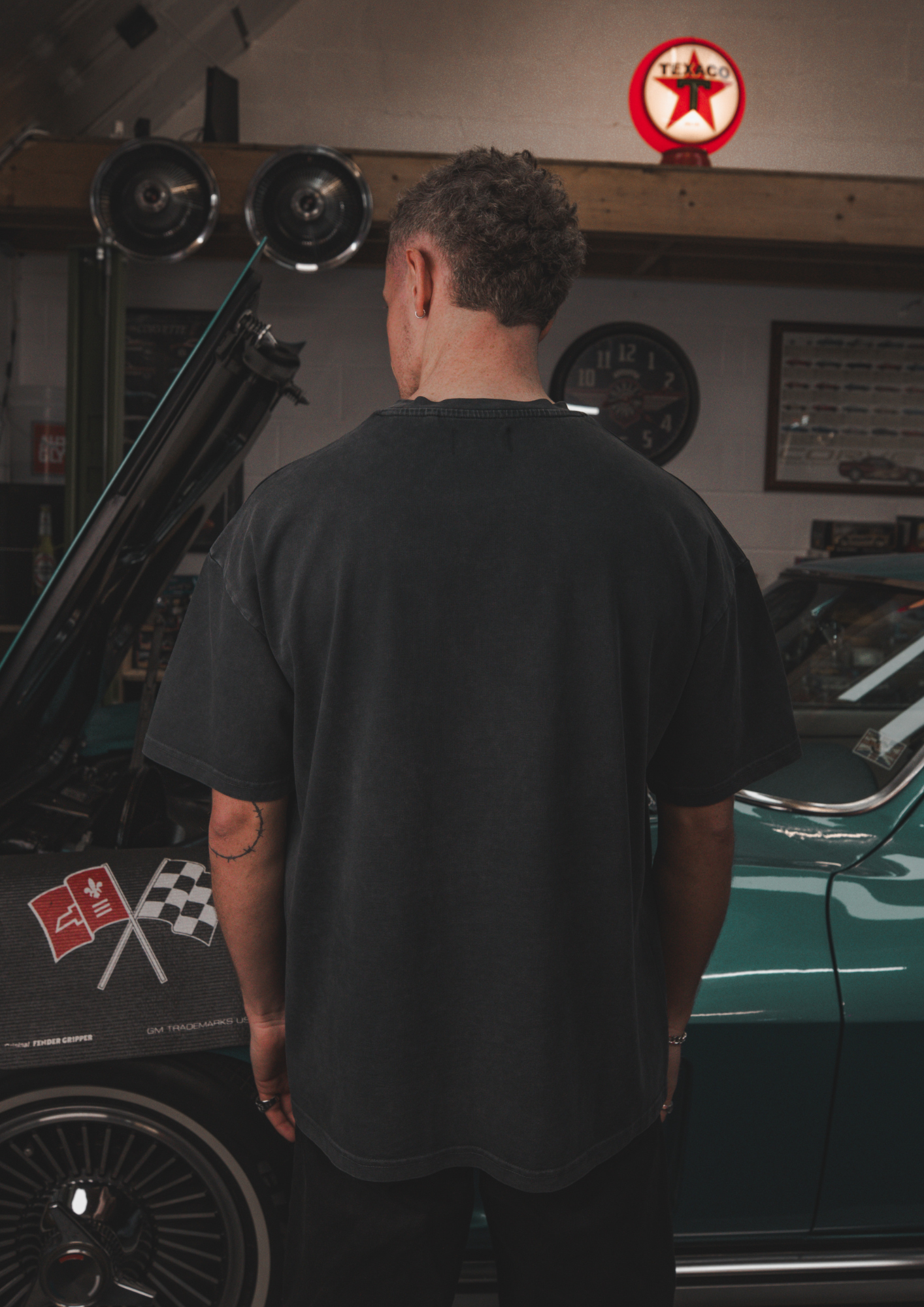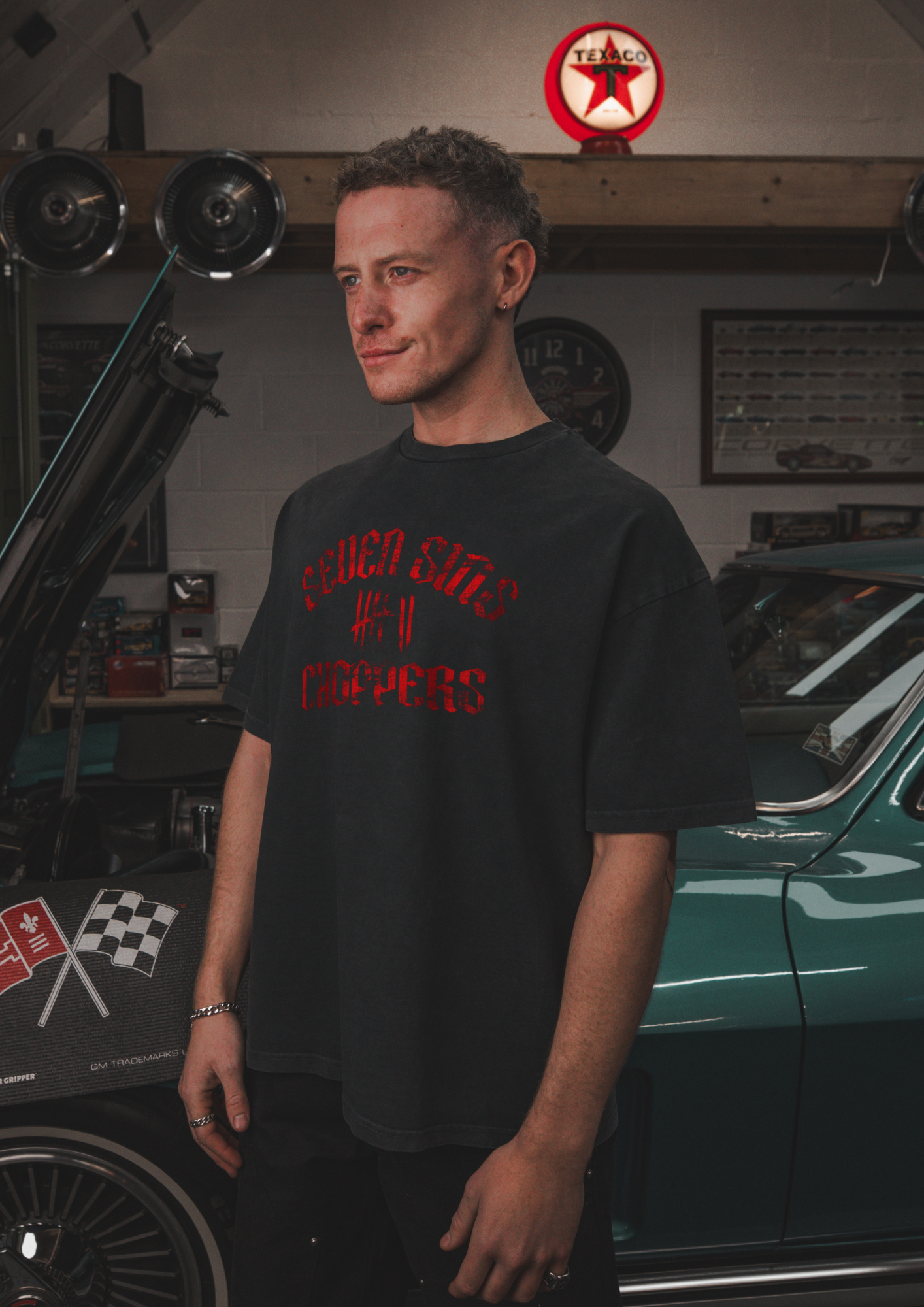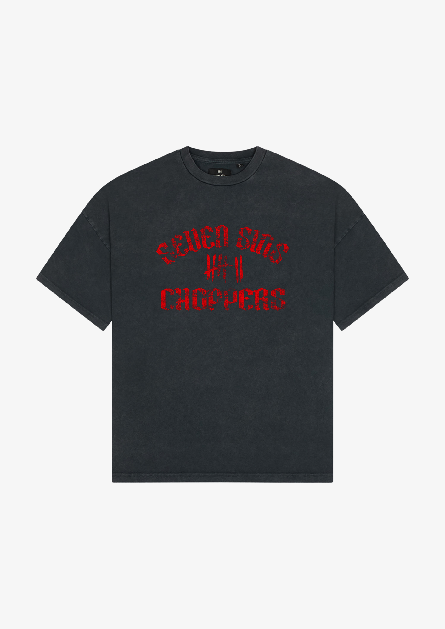 Introducing the Seven Sins Choppers Tee in Vintage Black. This T-Shirt is crafted from premium 300gsm heavyweight cotton, offering a substantial, premium feel. Its boxy silhouette provides a relaxed fit. Each piece is individually hand-finished, featuring Seven Sins Choppers Tee graphics to the front