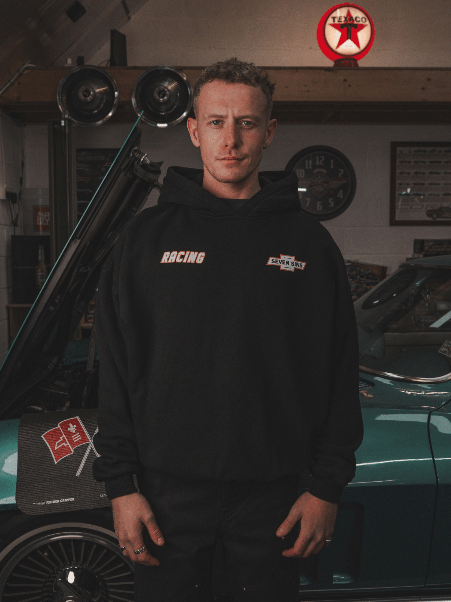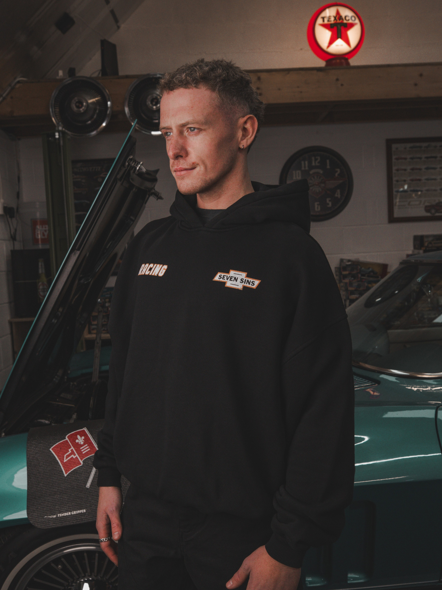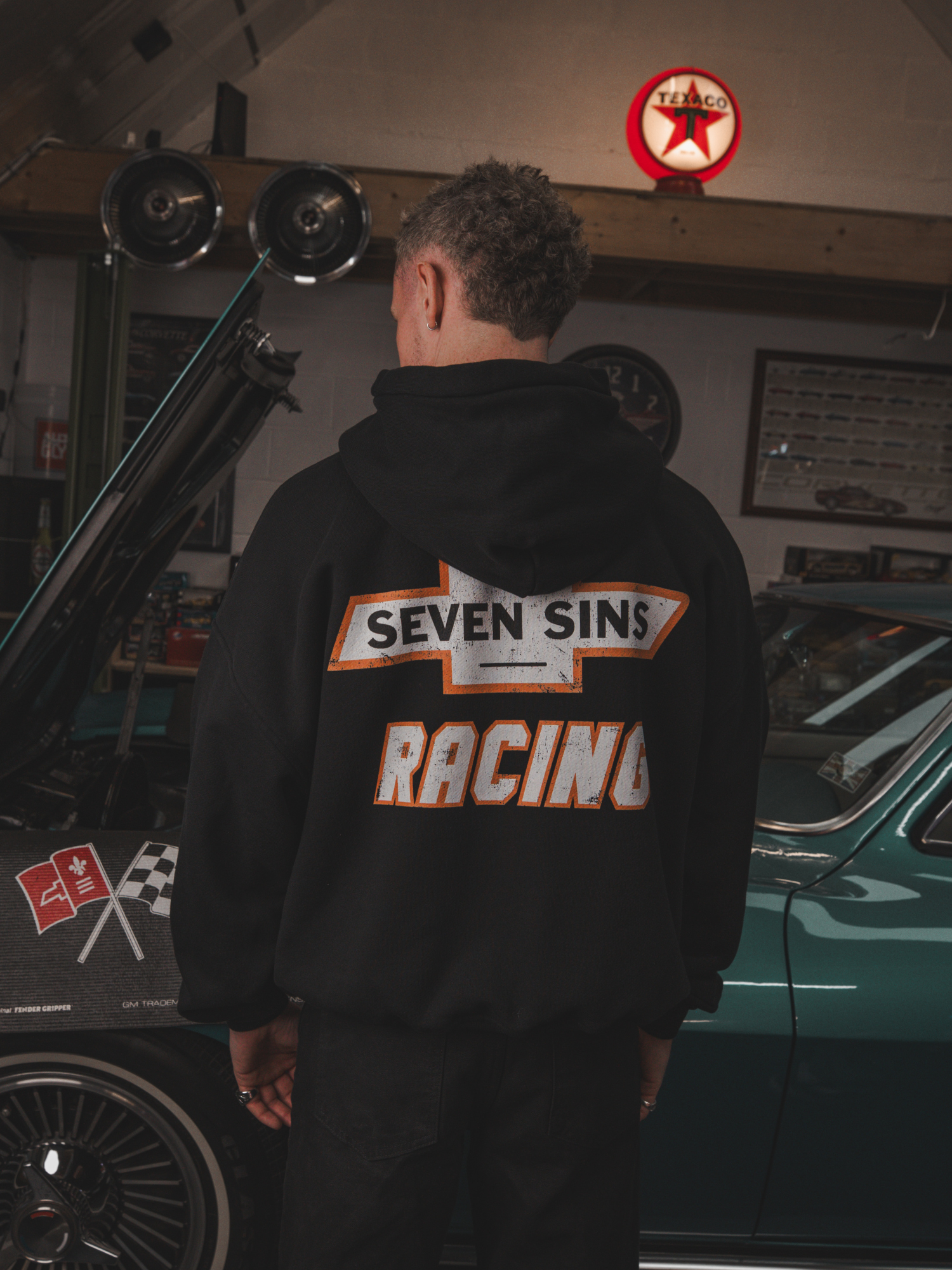 Introducing the Nascar Hoodie in Black. This Hoodie is crafted from premium 490gsm heavyweight cotton, offering a substantial, premium feel. Its cropped, boxy silhouette with slightly dropped shoulders provides a relaxed fit. Each piece is individually hand-finished. Featuring Seven Sins Racing graphics to both sides of the chest and back. Finished with slight distressing to the hood and the cuffs.