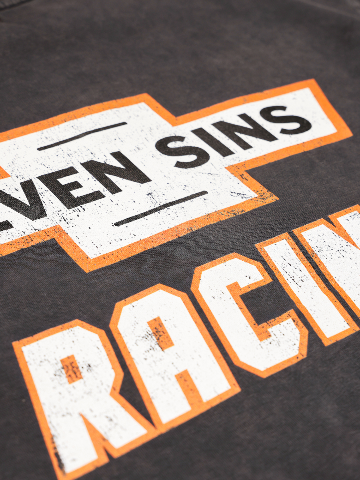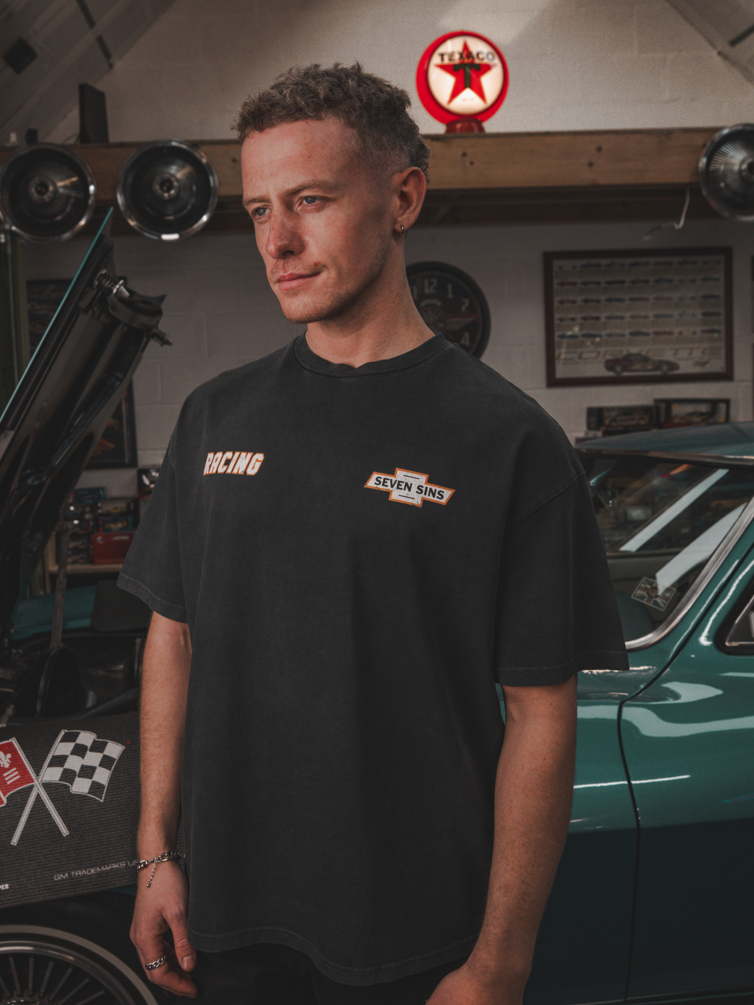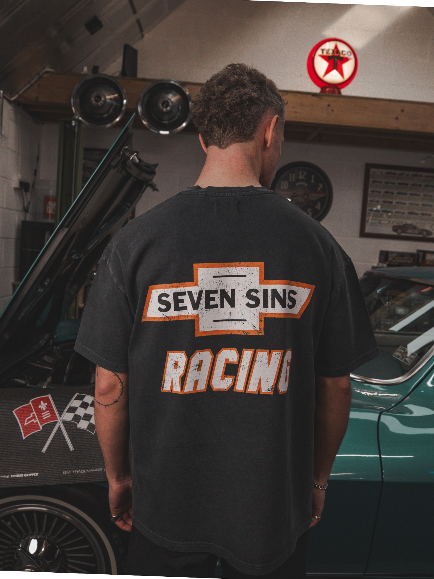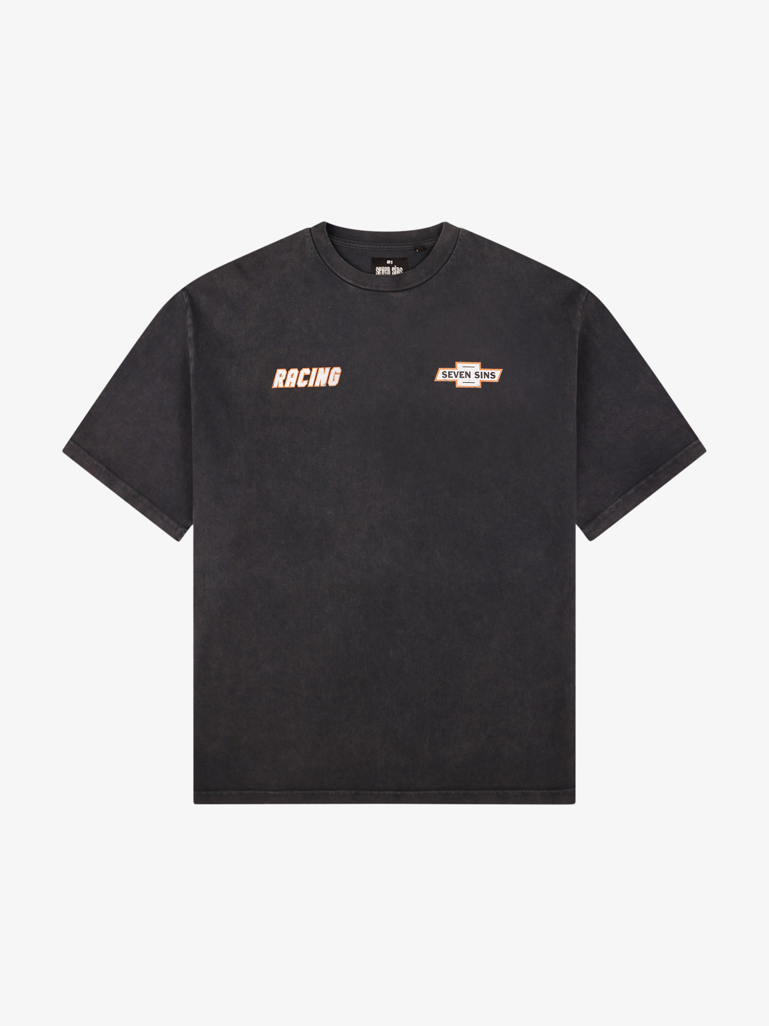 Introducing the Nascar T-shirt in vintage black. This T-Shirt is crafted from premium 300gsm heavyweight cotton, offering a substantial, premium feel. Its boxy silhouette provides a relaxed fit. Each piece is individually hand-finished, featuring Seven Sins Racing graphics to both sides of the chest and back.