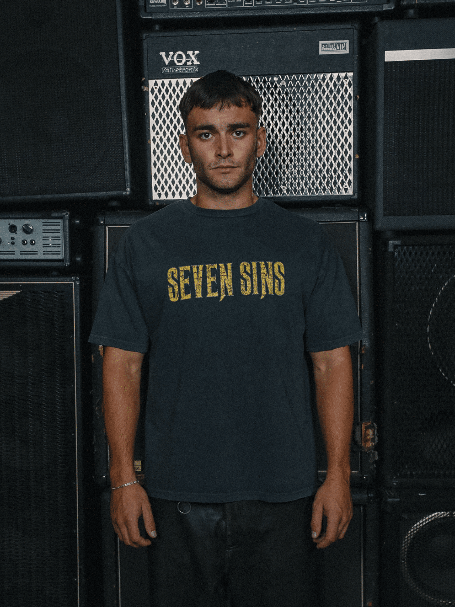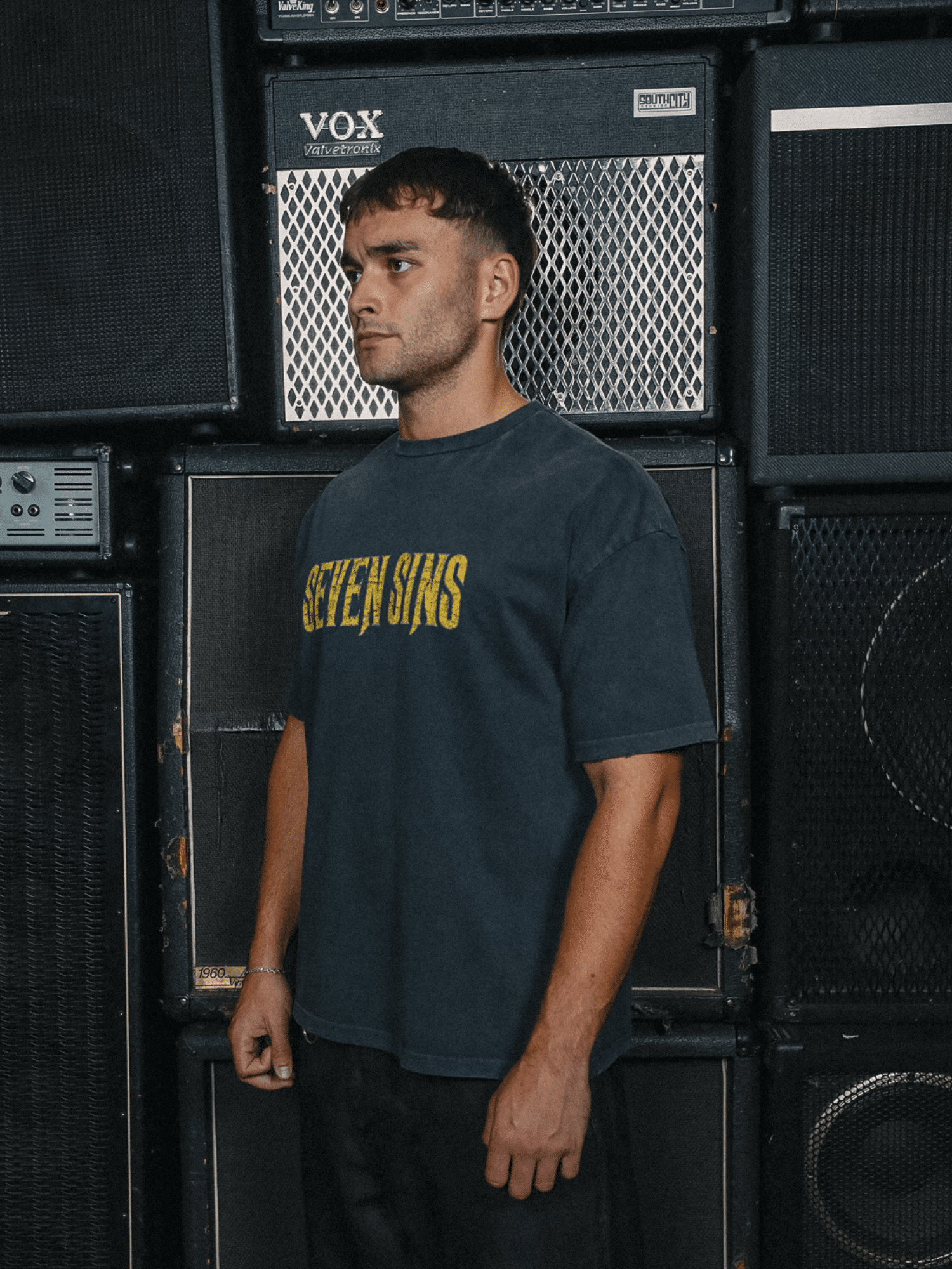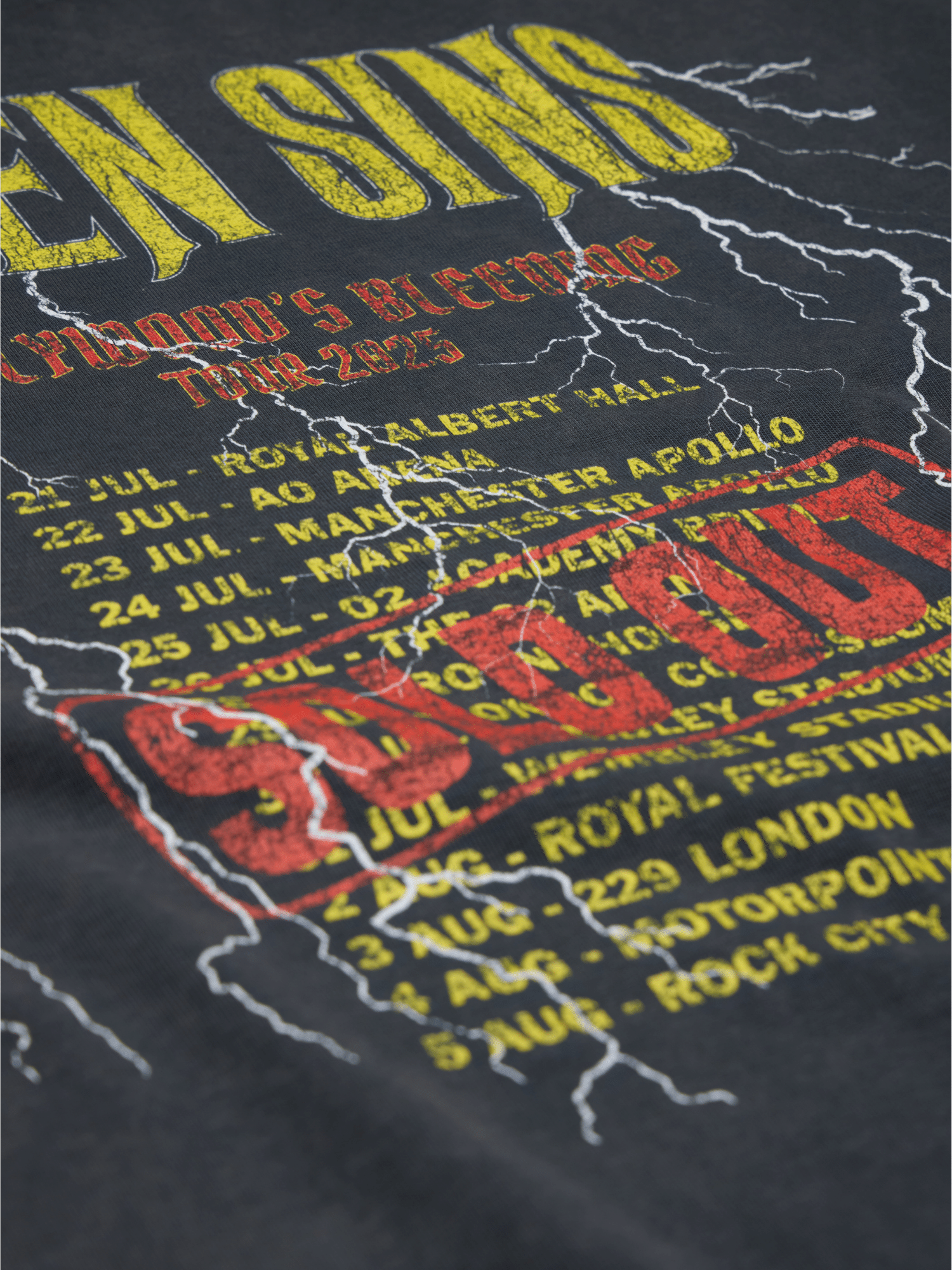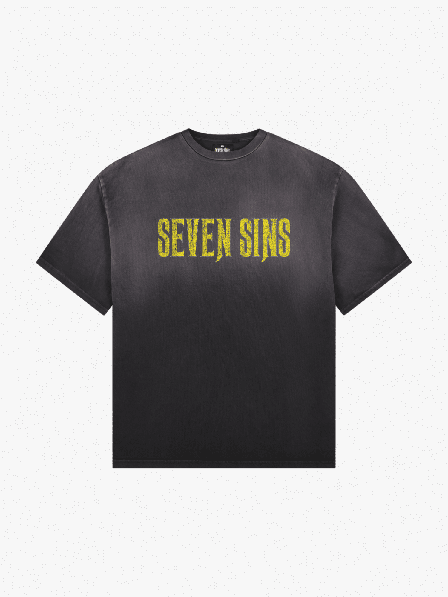 Introducing the Sold Out Tour T-Shirt in Vintage Black. This T-Shirt is crafted from premium 300gsm heavyweight cotton, offering a substantial, premium feel. Its boxy silhouette provides a relaxed fit. Each piece is individually hand-finished, featuring distressed Seven Sins text printed across the front and custom Sold Out Tour artwork on the back.